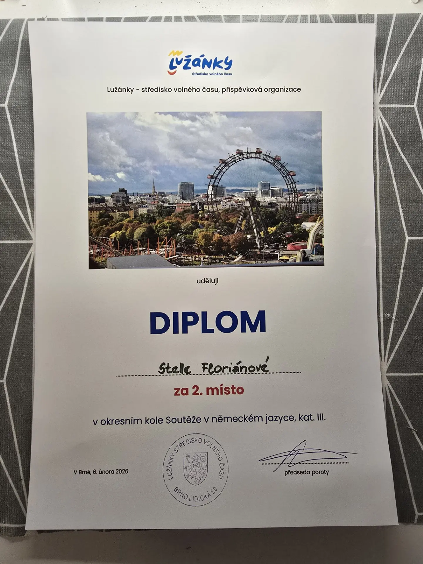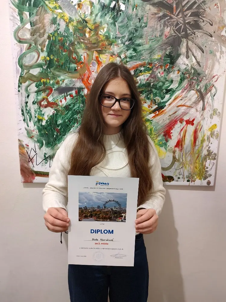 Stella Floriánová (2. D) - vítězka školního kola Soutěže v cizích jazycích (v německém jazyce) - reprezentovala naši školu i v okresním kole soutěže (kategorie III), které se konalo 6. 2. 2026 v Brně.